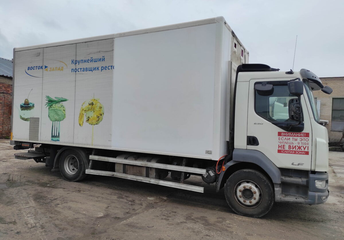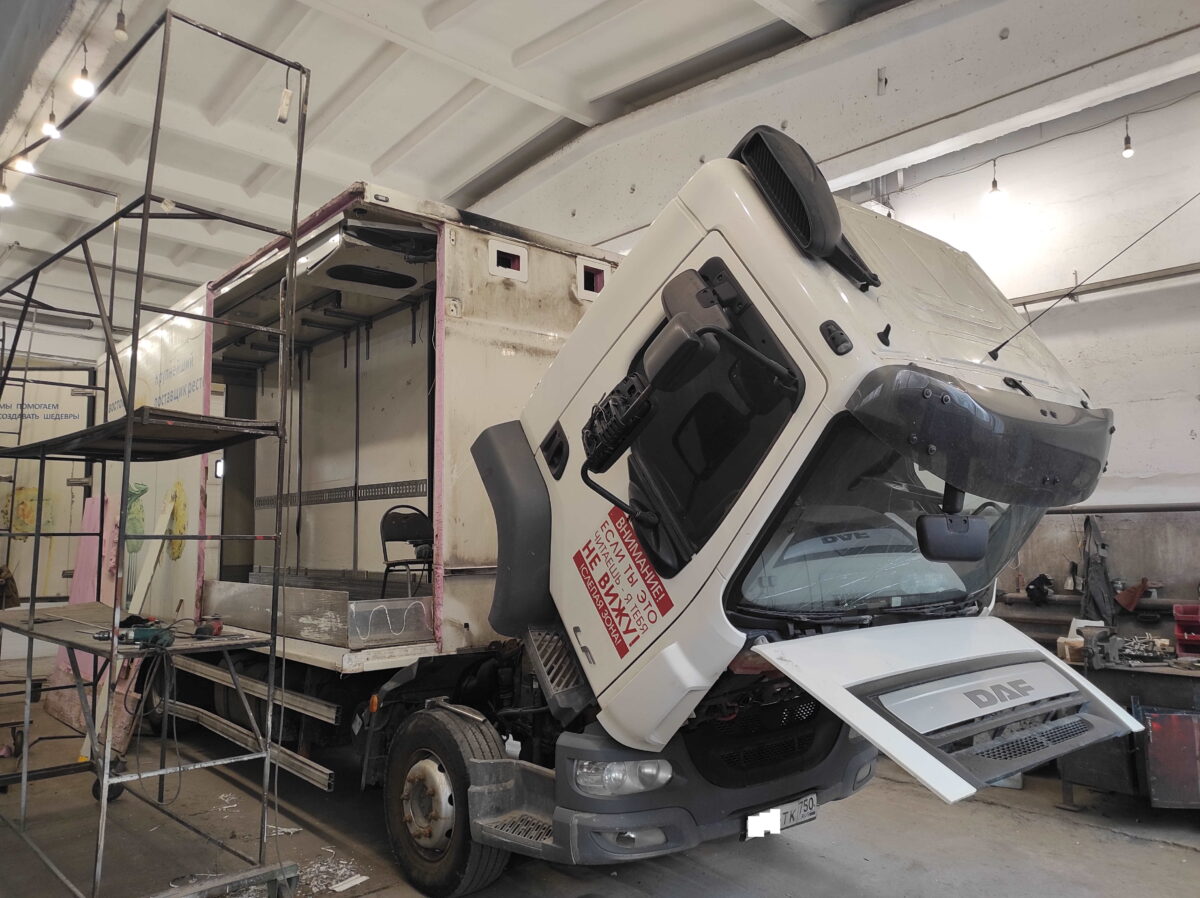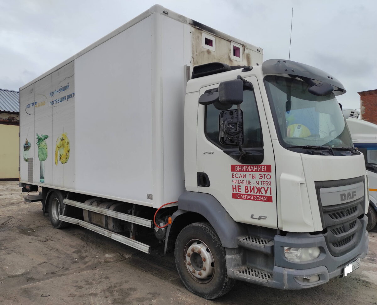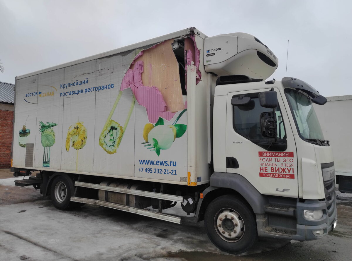 В результате ДТП получил повреждение передний правый угол фургона-рефрижератора на шасси DAF. Автомобиль приехал к нам в ремонт по направлению от страховой компании.